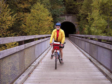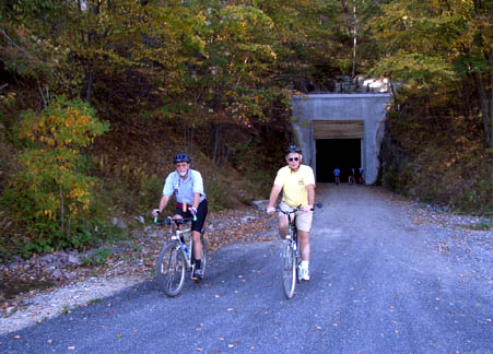 Gentle SavageThe Big Savage Tunnel through Savage Mountain is the critical connecting link in the Great Allegheny Passage. It won’t be officially open until summer 200, but this preview was offered as part of the Grand Opening of the Allegheny Highlands Trail in Maryland in October 2004 (the tunnel is actually a couple of miles into Pennsylvania, so it’s on the PA segment). In the foreground are leaders of the Allegheny Highlands Trail in Maryland and the Montour Trail. |