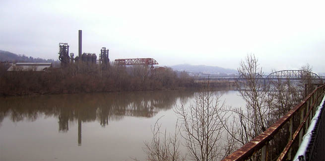 Waterfront TrailThe old Homestead Works of the US Steel Corporation on the banks of the Monongahela River is being redeveloped as a shopping, living, dining, and entertainment complex. The former rail line along the bank has become part of the Steel Valley Trail. |