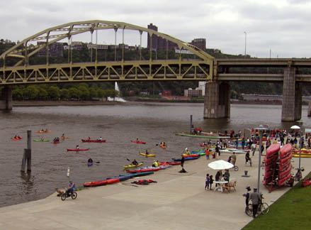 Paddling Demo DayNorth Shore section of Three Rivers Heritage Trail As part of one of the riverfront festivals, local canoe and kayak clubs and dealers brought boats down to the river to give introductory lessons and give people a chance to try out the sport. I’m pretty sure that everyone in the boats is wearing PFDs. This is part of Pittsburgh’s very successful redevelopment of the riverfronts as public recreational space. |