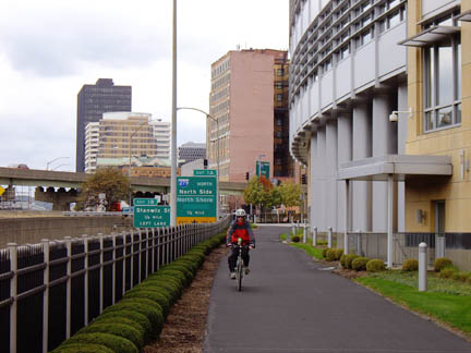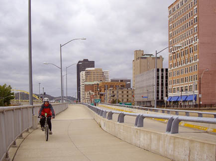 Entering Pittsburgh at FirstsideThree Rivers Heritage Trail segment of the Great Allegheny Passage When PNC Bank built their Firstside Building, they provided a continuation for the Eliza Furnace Trail to continue toward the ultimate destination of the Great Allegheny Passage, The Point at the junction of the Monongahela and Allegheny Rivers |