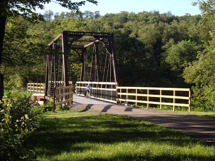 Hot Metal BridgeThree Rivers Heritage segment of Great Allegheny Passage, Pittsburgh PA Two near-identical railroad bridges share a single set of piers. The Monongahela Connecting RR bridge on the left once carried general rail traffic and was converted for vehicle use. The Hot Metal Bridge on the right was used to shuttle hot metal from the Pittsburgh Works furnaces to the South Side Works rolling mills; it was converted for bike/ped use. Because of the strategic concentration of rail traffic and steel production, this pair of bridges was the nations’ highest-priority bridge for protection from enemy attack during World War II. |