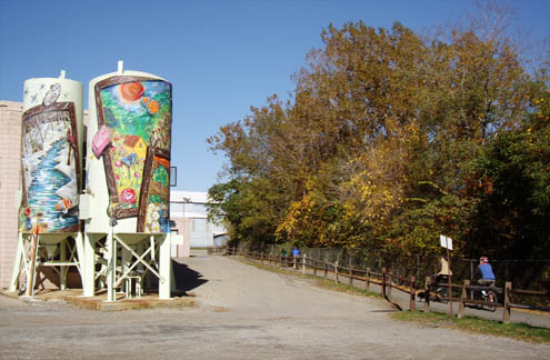 From Tanks to Trail ArtYoughiogheny River Trail segment of Great Allegheny Passage, near Connellsville PA As part of an ongoing effort to help communities near the trail integrate the trails in the towns and their economies, a number of art projects have been developed along the trail. Here, three tanks at an industrial plant adjacent to the trail have been decorated. |