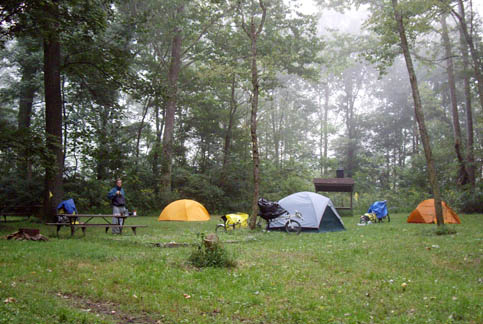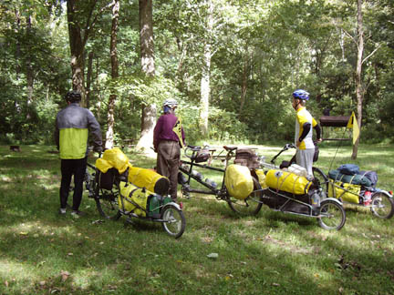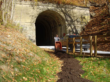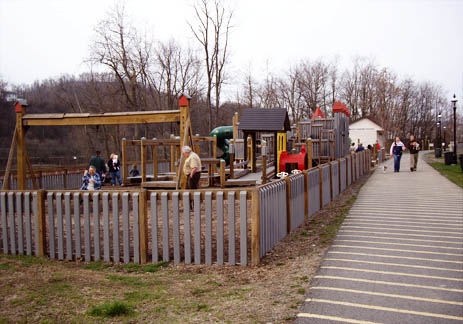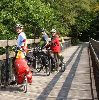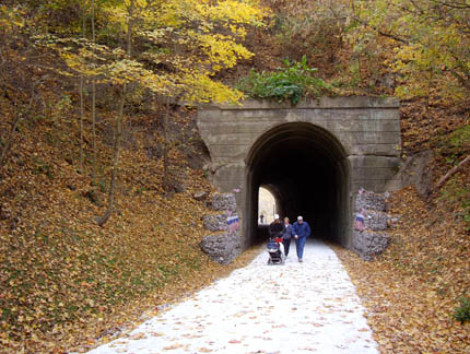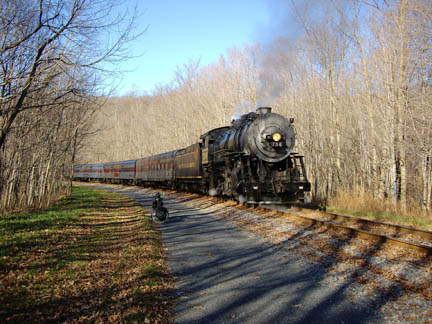Trail with Steam TrainFrom Cumberland MD to Frostburg MD, the Great Allegheny Passage shares the railbed with the Western Maryland Scenic RR, which still operates a steam train |