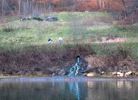 Acid Mine Discharge RemediationThe Trux Mine was once one of the worst abandoned mine water discharges in Pennsylvania, with mine water cascading down this slope and coating the bank with bright orange sludge. A remediation project is capturing the sludge, leaving a stable hillside that supports vegetation.