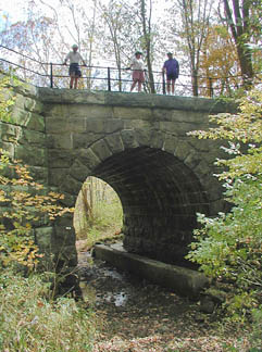 Stone Arches over Conemaugh LakeWhen the Corps of Engineers built a flood control lake here half a century ago, the railroad was relocated to higher ground. The stone bridges that formerly carried the railroad over the valley now carry the West Penn Trail |