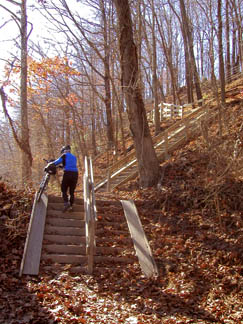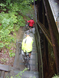 Stairs up Bow RidgeWest Penn Trail, Conemaugh Lake, east of Saltsburgh PA The active railroad runs alongside the interurban line that has been converted to the trail |