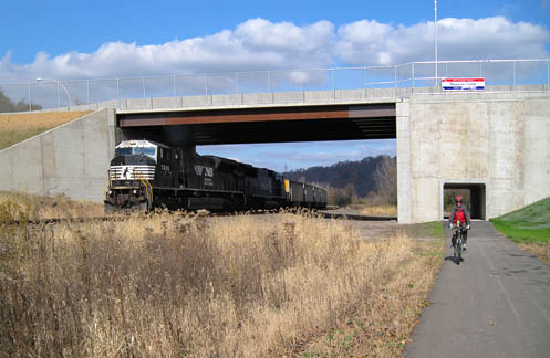 Sharing the route at DuquesneThe trail parallels the Norfolk Southern mainline between the Riverton Bridge and McKeesport. When this flyover was recently constructed as part of an industrial park development, special provision was made for the trail to go through one of the abutments