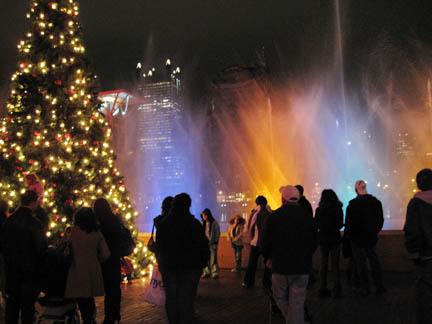 Pittsburgh at Night in Station SquareStation Square is a shopping and restaurant complex in the former P&LE Railroad Station across the Monongahela River from downtown Pittsburgh. It features a “dancing fountain”, which was brilliantly lit on Light Up Night. The trail is just the other side of the fountain from this view.