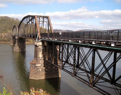 Riverton BridgeThe challenge of a safe trail crossing of the Monongahela River near McKeesport was resolved by rerouting the little remaining traffic that used the Riverton Bridge, abandoning the bridge for railroad use, and converting the bridge for trail use. Photo by Roy Weil |