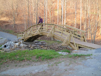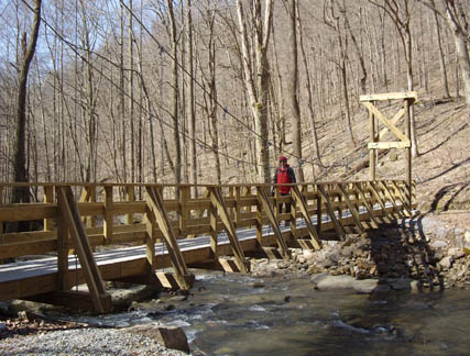 Bridge on Roaring Run TrailA bridge at the mouth of a small side creek rises high to provide passage for high water. |
