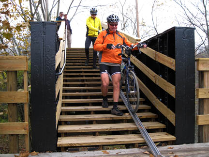 Safety Improvement at Venice CrossingThe Montour Trail, otherwise continuous for many miles in both directions, is interrupted at this intersection by a missing bridge. The trail continues to both ends of the demolished bridge, but the bridge is 15 feet above the road. Trail travelers have been forced to detour for a half mile along busy PA50. An all-volunteer project of the trail group reduced the hazards for trail users by installing a stairway from the old bridge down to the side of the road. The slope of the stairs and a wheel trough provide easy passage for bicyclists |