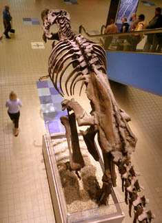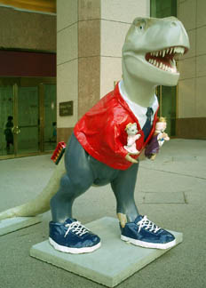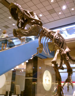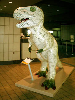 Another public dinosaur, T. rex, greets visitors to Pittsburgh at the airport, at the airside end of the train.