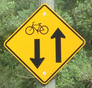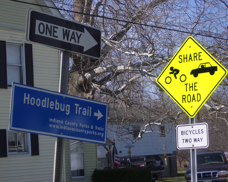 The Hoodlebug Trail in Indiana County PA has a short section on-road in Homer City. To keep the on-road segment out of traffic, it includes a contra-flow segment.