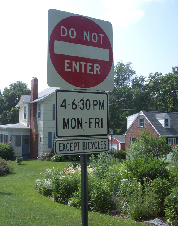 A bicycle route parallels a busy road. To keep the bike route off the busy road, it goes counter-flow on a street that's one-way during rush hour.