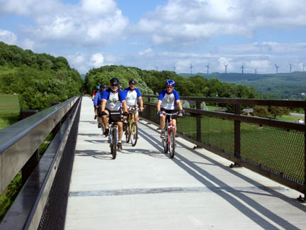Salisbury TrestleThe Salisbury Trestle carries the Great Allegheny Passage high above the Casselman River valley just west of Meyersdale, with spectacular views up and down the valley. This photo shows a group of bicyclists on their way from Washington DC to Pittsburgh.