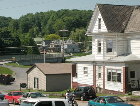 Rockwood. The trail is just this side of the blue Rockwood Trail House at the far end of the bridge |