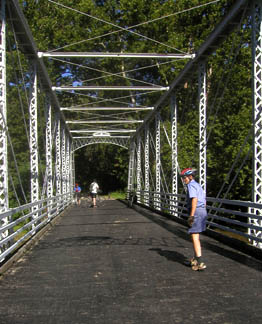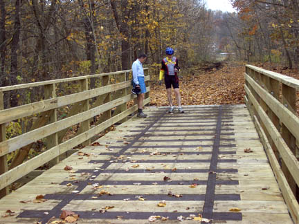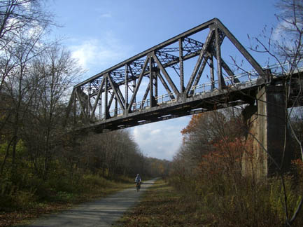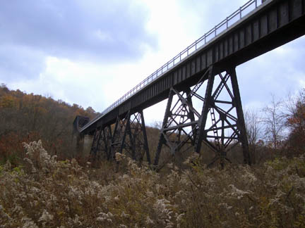 Trail Under CoverCuyahoga Valley Trail, near Cleveland, OH The high structure is the historic trestle built by the New York Central RR in 1907 to bypass congestion in Cleveland. It’s 160 ft high, 1988 ft long and still carries 40-50 trains a day. Beneath it are a variety of pipelines. The trail passes under all of this – to protect trail users from stuff falling from the trains, the trail developer installed a protective structure much like a covered bridge. |