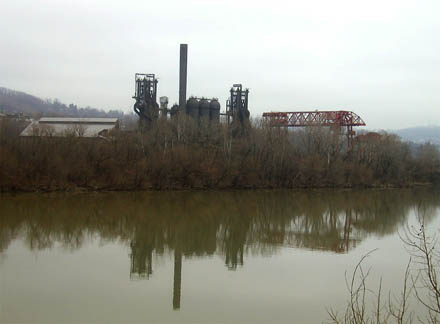 Carrie FurnaceThe Waterfront section of Steel Valley Trail in Homestead PA, looking across the Monongahela River The old Homestead Works of the US Steel Corporation on the banks of the Monongahela River is being redeveloped as “The Waterfront”, a shopping, living, dining, and entertainment complex. Trail is also being developed on the other side of the river. Eventually this trail will reach the Carrie Furnace complex, site of the historic 1892 battle between striking steelworkers and the Pinkerton detective agency. In its prime, Carrie Furnace produced 600 tons of steel ingots each day. The hot ingots were carried across the single-purpose “hot metal bridge” to the rolling mills in Homestead. The hot metal bridge, just to the right of this photo, will become a trail bridge linking the two riverside trails. |