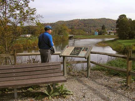 Interpreting the TurkeyfootJust north of Confluence PA, at the junction of the rivers George Washington passed this way. He called this the “turkeyfoot” by way of describing the unusual 3-way confluence of the Youghiogheny River, the Casselman River, and Laurel Hill Creek (yes, that’s why the town is called Confluence). From this little rest area you can see Laurel Hill Creek (under the bridge in the middle distance) and the Casselman River (coming from behind the trees on the right) conflow with the Youghiogheny River (entering just behind the fence on the right and exiting to the left). The interpretive sign features George Washington at approximately this location. |