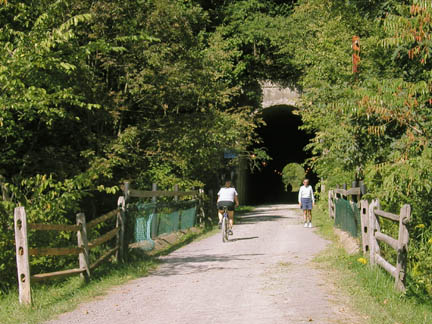 Savage TunnelAt the north end of Big Savage Tunnel The Big Savage Tunnel through Savage Mountain is the critical connecting link in the Great Allegheny Passage. It was opened this year, to the great delight of walkers and bicyclists throughout the region. This is the north portal (on the Pennsylvania side). |