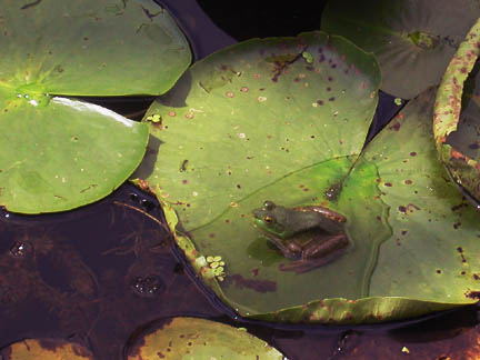 FrogCuyahoga Valley National Recreation Area, south of Cleveland OH The trail goes through a wetland on a wooden boardwalk. An observation platform along the boardwalk provides a place to watch the animals that live in the wetland. This frog tried to blend in with the lily pad, |