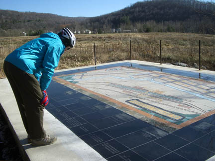Interpreting a former Mine SiteAcid mine restoration area across Blacklick Creek from Vintondale The Ghost Town Trail passes through several areas that were devastated by coal mining. One of the most extensive of these areas is under restoration, featuring art installations as part of the restoration. This mosaic alongside the trail interprets the mining operations that once took place here. |