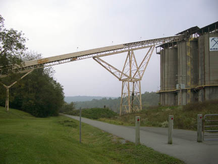 Gravel SilosAlongside Deckers creek east of Morgantown These silos handle crushed stone, transferring it to barges on the river. The trail runs underneath the conveyer. |