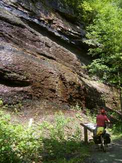 Reading the RockBetween Confluence PA and Connellsville PAAn old railroad cut provides an opportunity for a geology lesson, and a trailside interpretive sign takes advantage of that opportunity. The dark layer near the top of the photo, running under the overhang behind the tree, is coal. |