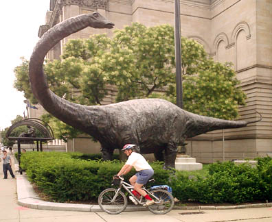 Chicago had cows, now Pittsburgh has dinosaurs. The Carnegie Museums and the City of Pittsburgh are hosting DinoMiteDays, a summer-long city-wide art-in-the-streets event. For us, it's 100 fiberglass dinosaurs. Artists from across the country competed for the chance to decorate them, regional companies have sponsored them, and they're on display in public places around the region. In October they'll be auctioned off to benefit the Carnegie Museum's world-class dinosaur exhibit. On display: