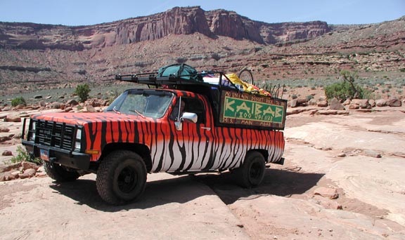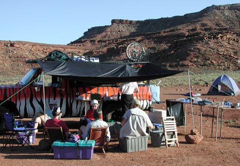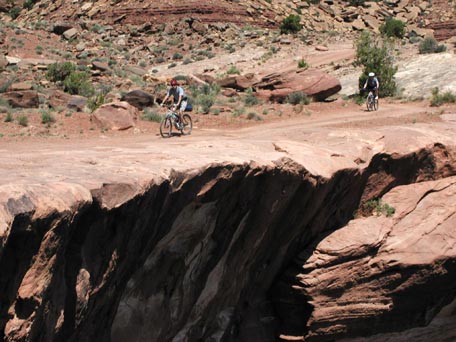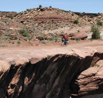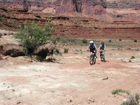 Someone asked us "is it like the Grand Canyon?", and we replied that it's a bit like being on the top of the Grand Canyon as you look to the left and the bottom of the Grand Canyon as you look to the right, though it's at a more human scale. The top at Island in the Sky is at about 6000', and the bottom of the Shafer switchbacks is about 47-4800'. From there we worked our way down to about 4000' at Mineral Bottom (then climbed 1000' to the top of the Mineral Bottom switchbacks). In between there were two big 500' climbs and descents, and the rest was rolling with occasional short steep hills. Absolutely fantastic!