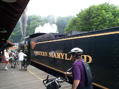 This is the day of transition between the C&O Canal Towpath and the Great Allegheny Passage. We begin at the Western Maryland Station in Cumberland, which is the terminus of the C&O Canal and the zero milepost for the Great Allegheny Passage. Since the latter trail will run alongside the Western Maryland Scenic RR, we take the steam train to Frosburg. At that point we catch a shuttle around the unfinished part of the trail, resuming in Meyersdale.